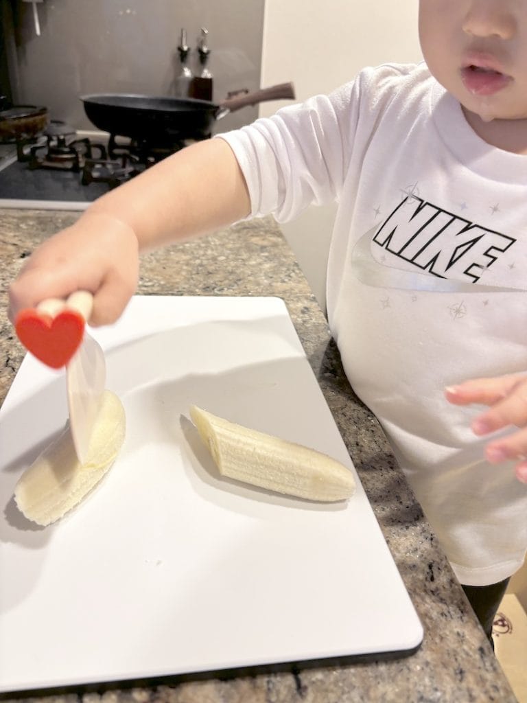 子供用包丁はカマンカッティ (COMMOn Cutty)を購入しました。これひとつで①切る ②刻む ③すくう ④潰す ⑤こす ⑥混ぜる ⑦和える ⑧集める ⑨のばす ⑩塗る ⑪ころがす ⑫分割するの、12役を担うことができるそうです。購入したところ、確かに手はきれないのに、果物や柔らかい野菜なら切れるという優れもの。子供に安心して与えることができました。