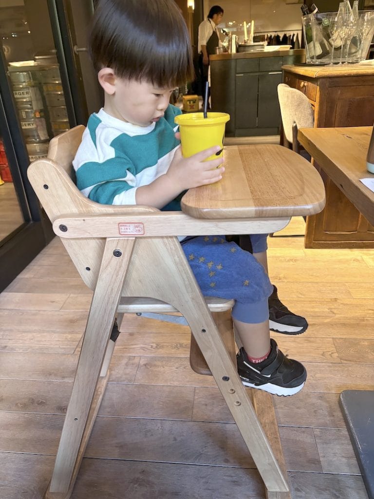 子供用の椅子も用意あり、しっかりベルトもついているので安心です。お冷やは、蓋付きストローカップに入れてくれるので、溢れる心配ありません。りんごジュースも子供用に頼むとこちらの蓋付きストローカップで提供してくれました。