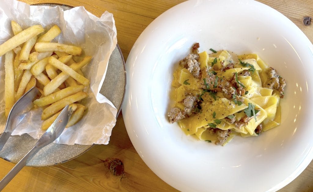 子供用に、「りんごジュース」「フライドポテト」「宮崎産佐土原ナスのアラビアータ」、大人用に「自家製サルシッチャとジロール茸の軽いクリームソース」「ビール」「スパークリング」を注文しました。どれもこだわりあり絶品!何を頼んでも美味しい!