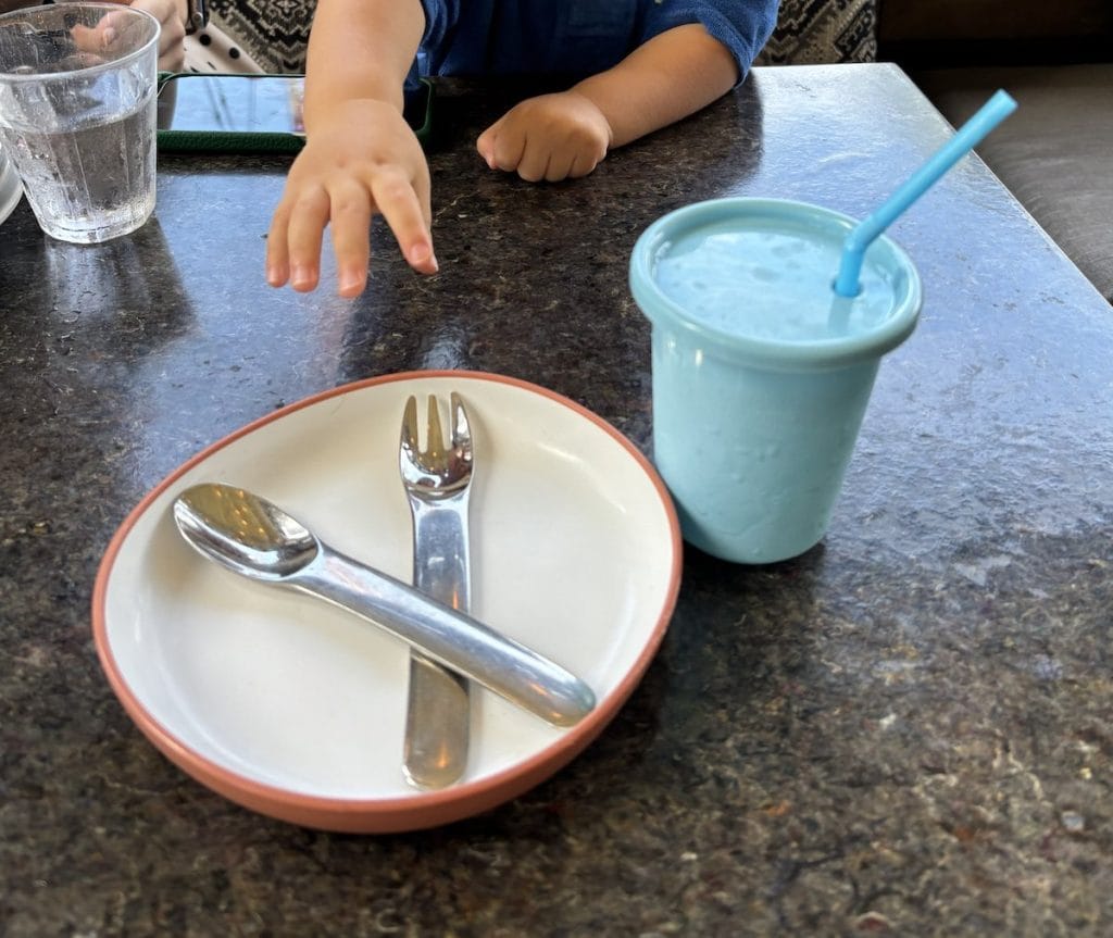子供用の水にはしっかり蓋とストローが付いていたので、こぼすことなく飲めました(母になってこういう気遣いが嬉しいことに気づきます)子供用の取分け皿、スプーン、フォークも用意していただきました。