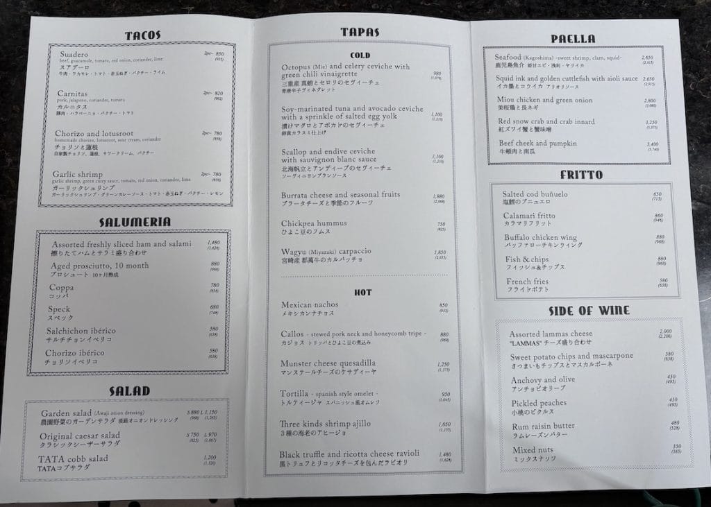 メニューは、タコス、サルメリア(生ハムやサラミ等)、サラダ、タパス、パエリア、フリット、つまみやデザート等がありました。